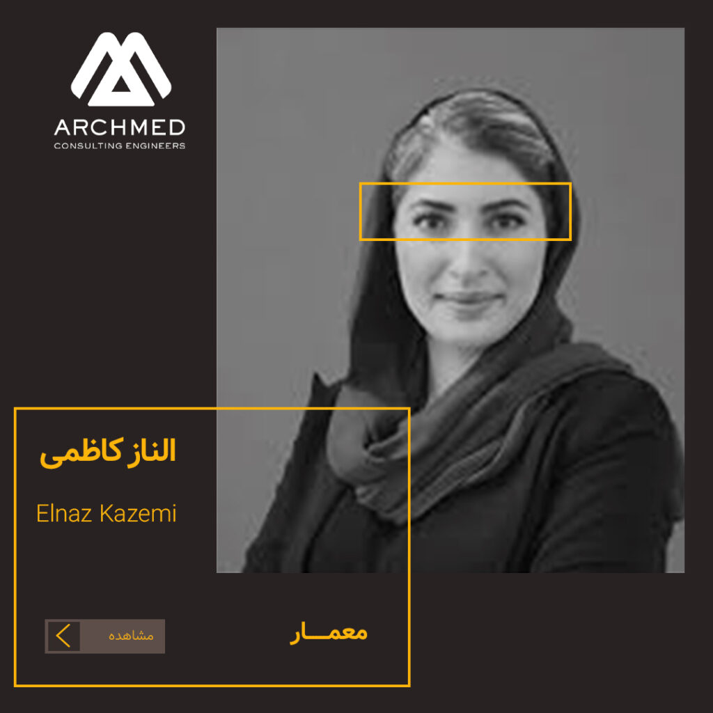 الناز کاظمی، مدیر دپارتمان معماری و رییس هیئت مدیره شرکت مهندسین مشاور. آرکمِد تخصص: معمار و طراح تخصصی بیمارستان. سوابق تحصیلی: کارشناسی مهندسی معماری، کارشناسی ارشد مهندسی معماری و کسب رتبه ۱۰ کنکور کارشناسی ارشد. دستاوردهای حرفهای: طراحی و نظارت بر اجرای پروژههای معماری با مجموع مساحتی بیش از سیصد هزار متر مربع و مدرس دورههای تخصصی BIM و REVIT در حوزه فضاهای درمانی و بیمارستانی