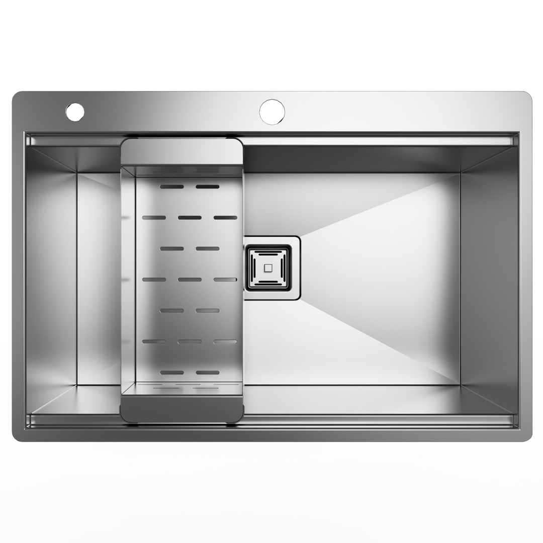 ابعاد این سینک شامل طول 74 سانتیمتر و عرض 50 سانتیمتر است. همچنین حالت پلهای در طراحی آن تعبیه شده تا بتوان از لوازم جانبی کاربردی مانند آبچکان آلومینیومی و میوهشور استیل بهراحتی استفاده کرد. میوهشور با طراحی مشبک، مانع از جمع شدن آب میشود و برای شستوشوی سریع میوه و سبزی بسیار مناسب است.